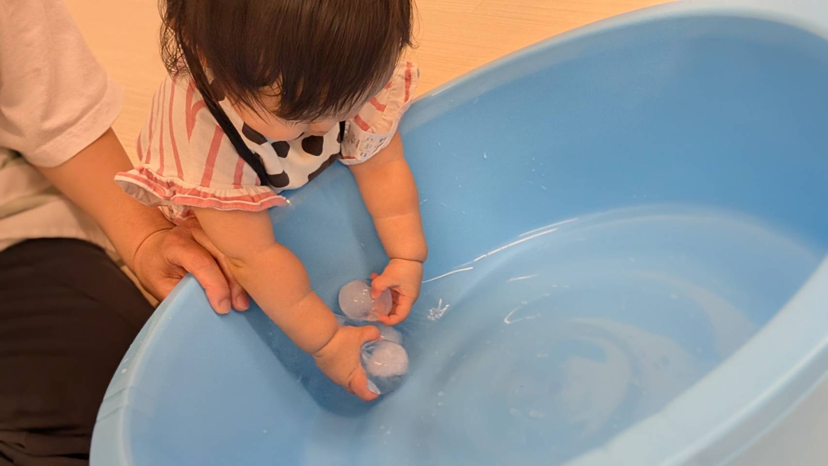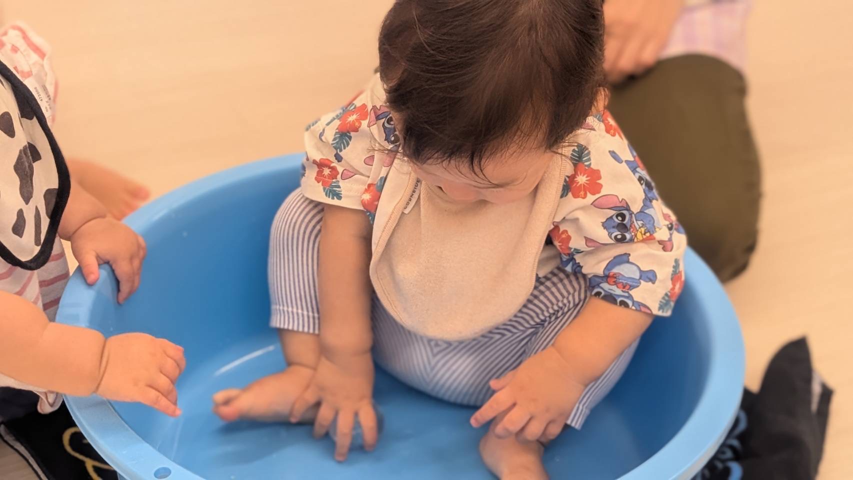 「つめたくて気持ちいいね」と保育者と一緒に楽しんでいました!