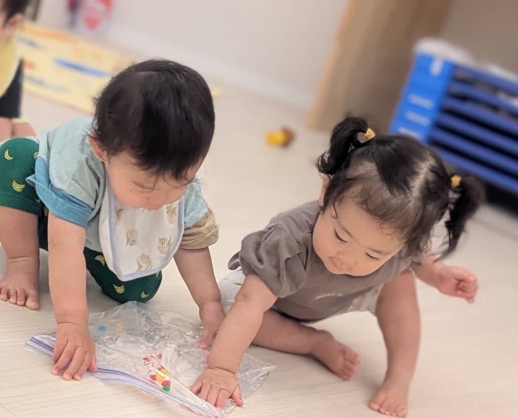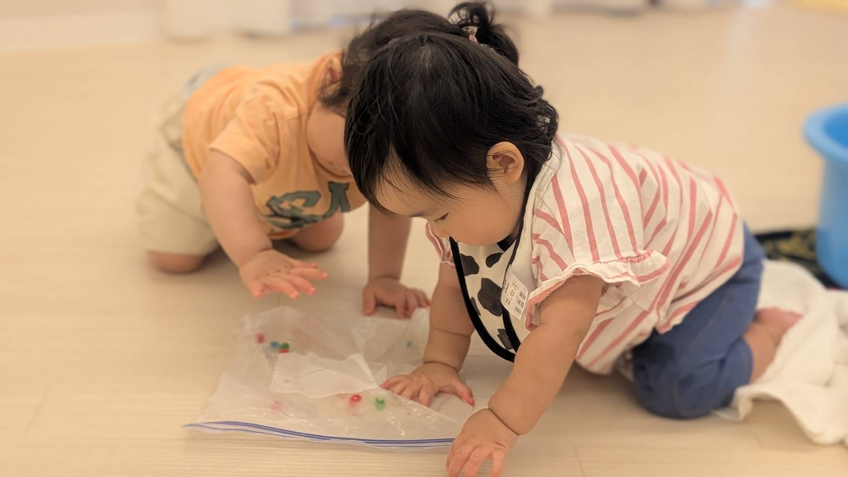 まずは、ジップロックに水と水でふくらむビーズを入れての感触遊び♪