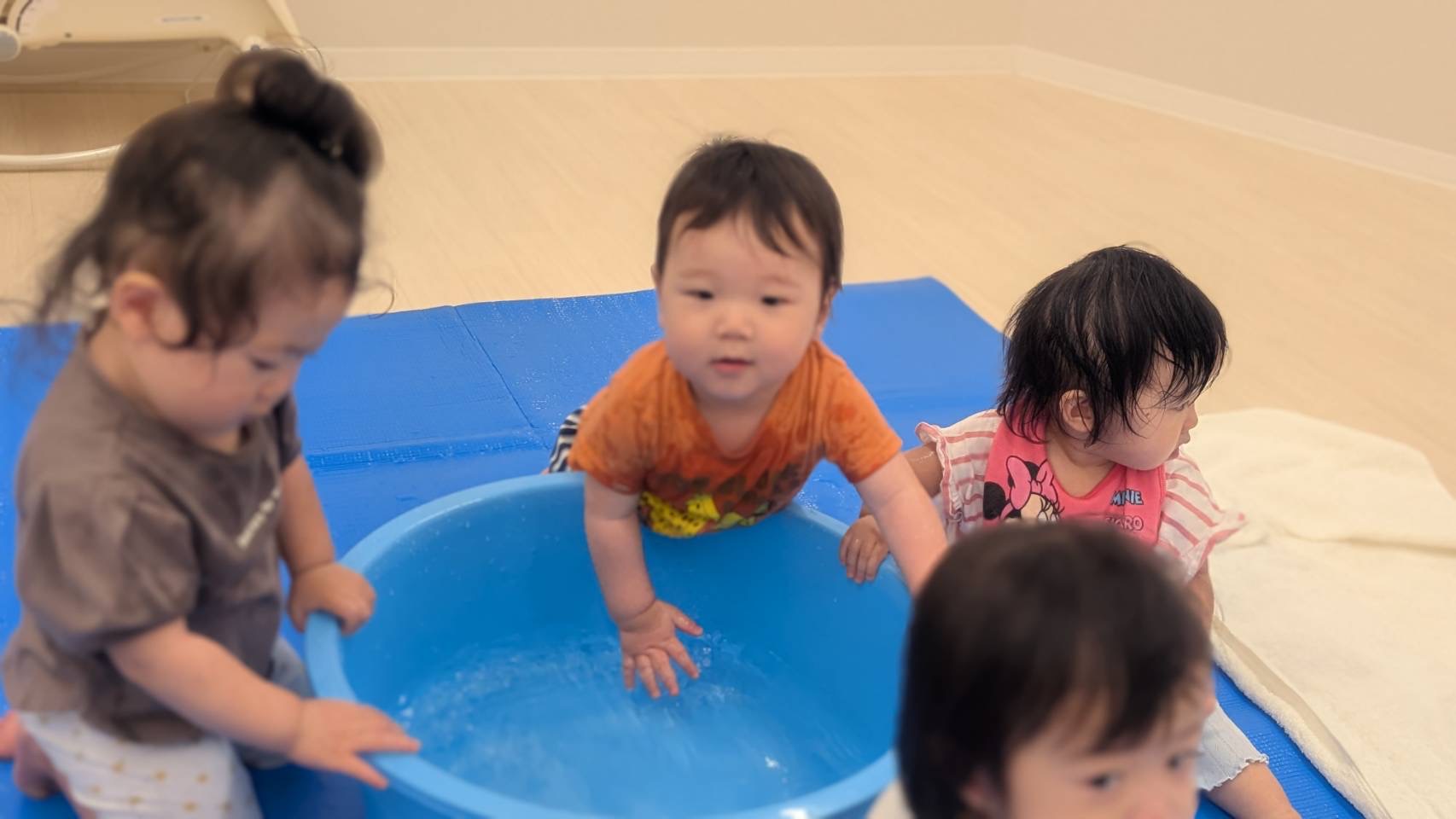 水の中に手を伸ばしバシャバシャと水を跳ねさせ、水の心地よさを感じながら気持ちよさそうに遊ぶ子どもたち。