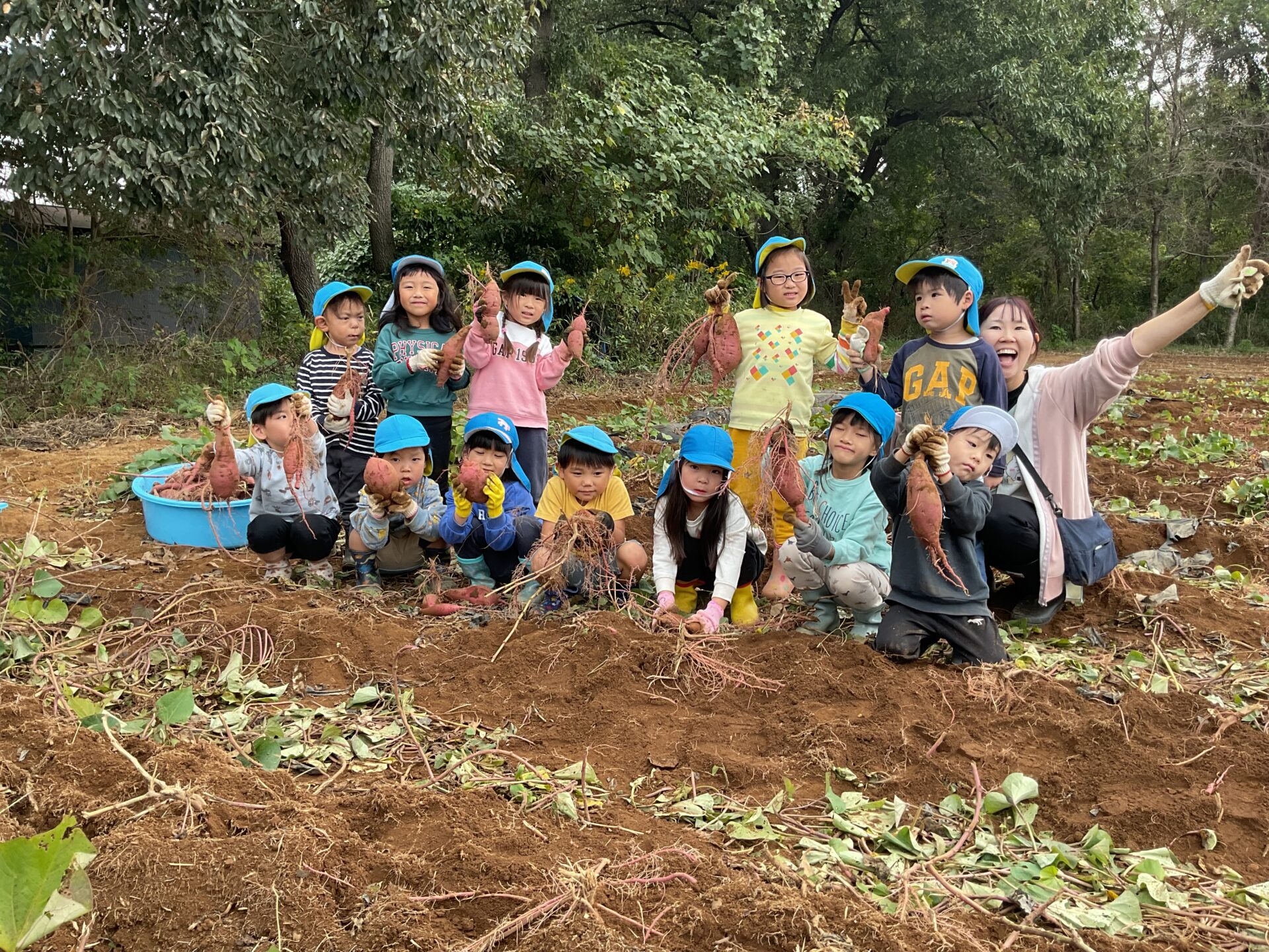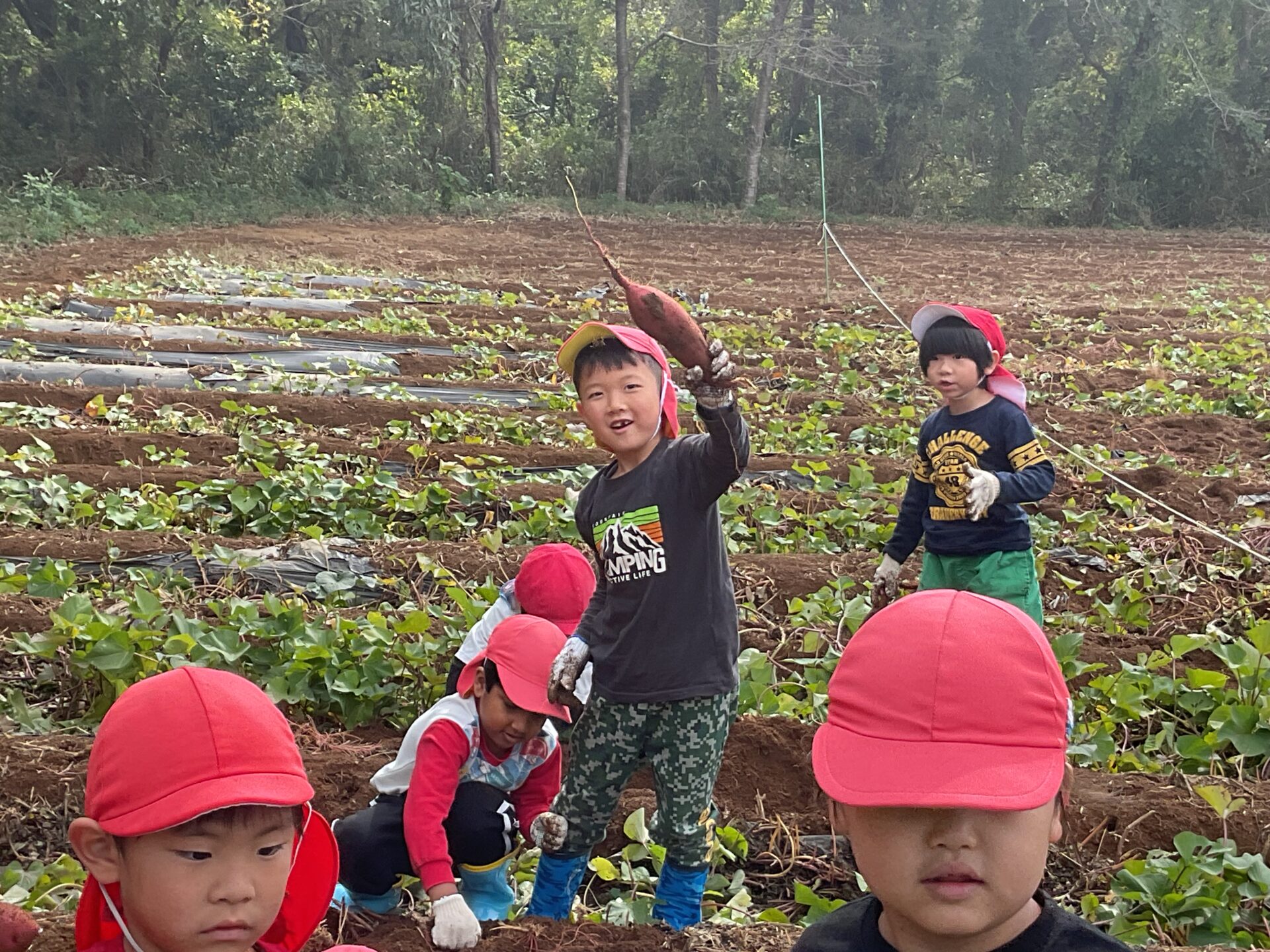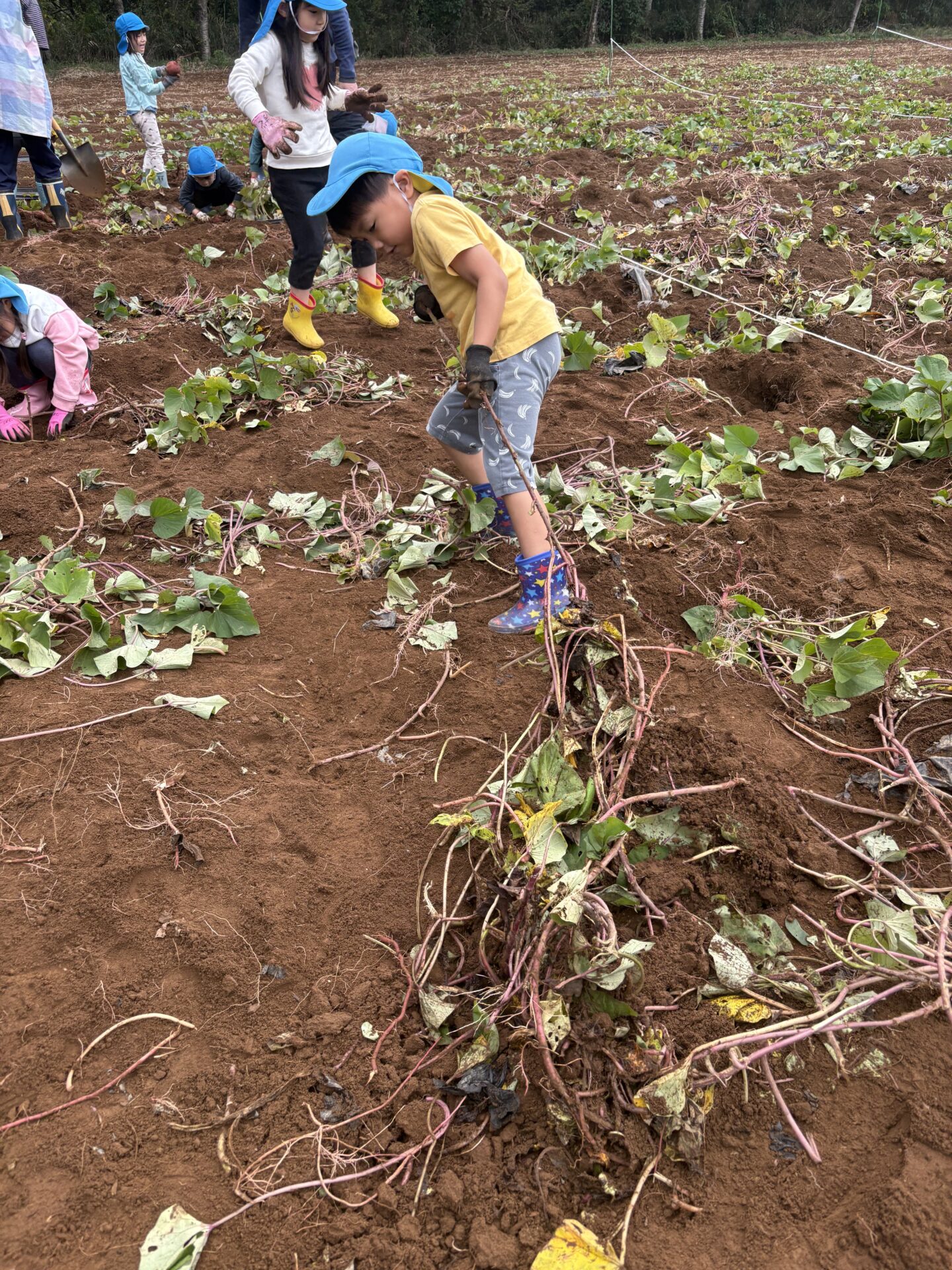 そらチームはさんも張り切って掘っていました。しかし中には抜けないさつまいももありましたが、足を踏ん張り、両手でぎゅっとつかみ「よいしょ、よいしょ」と一生懸命に引っ張り頑張ってぬいていました😊