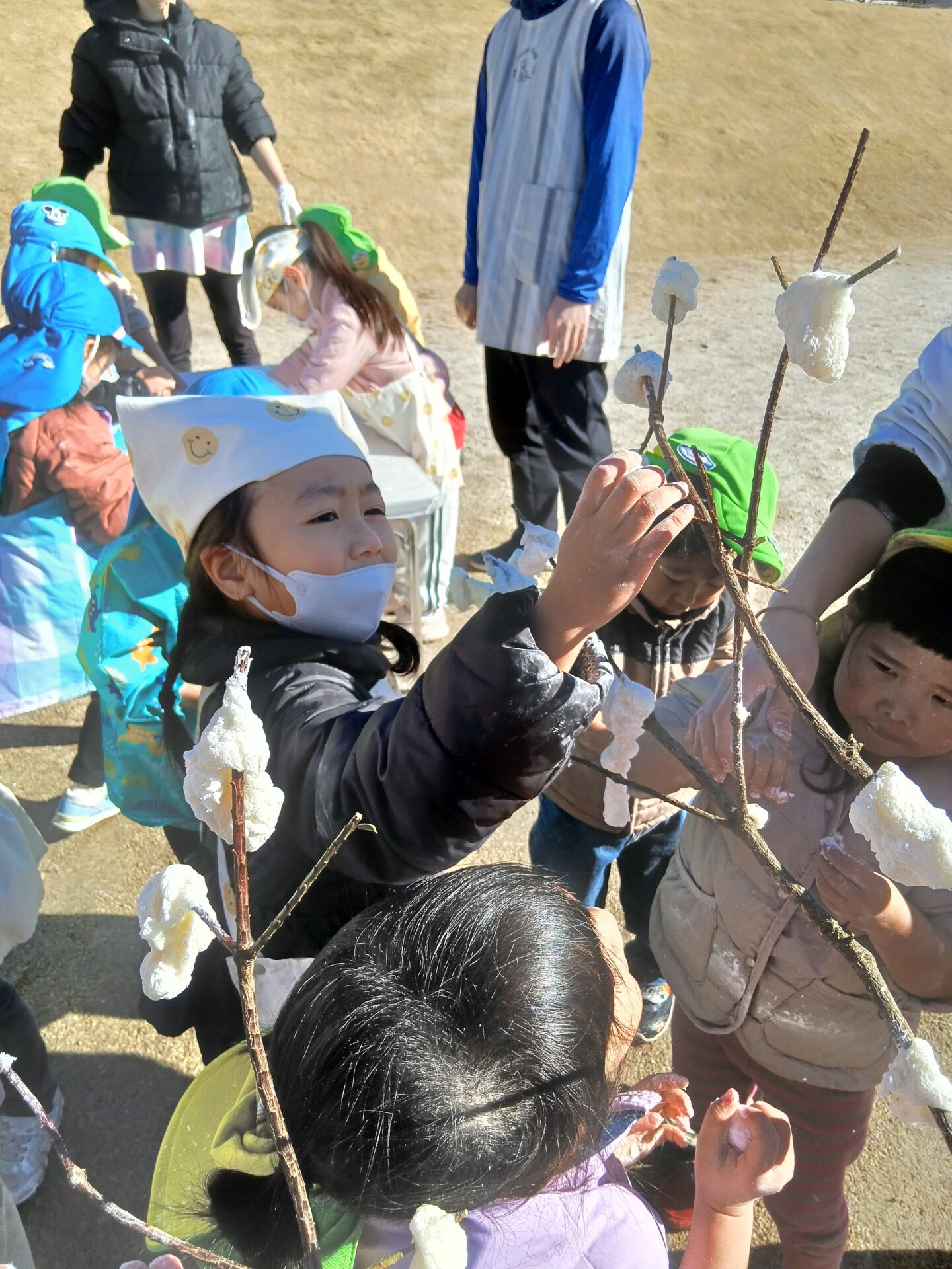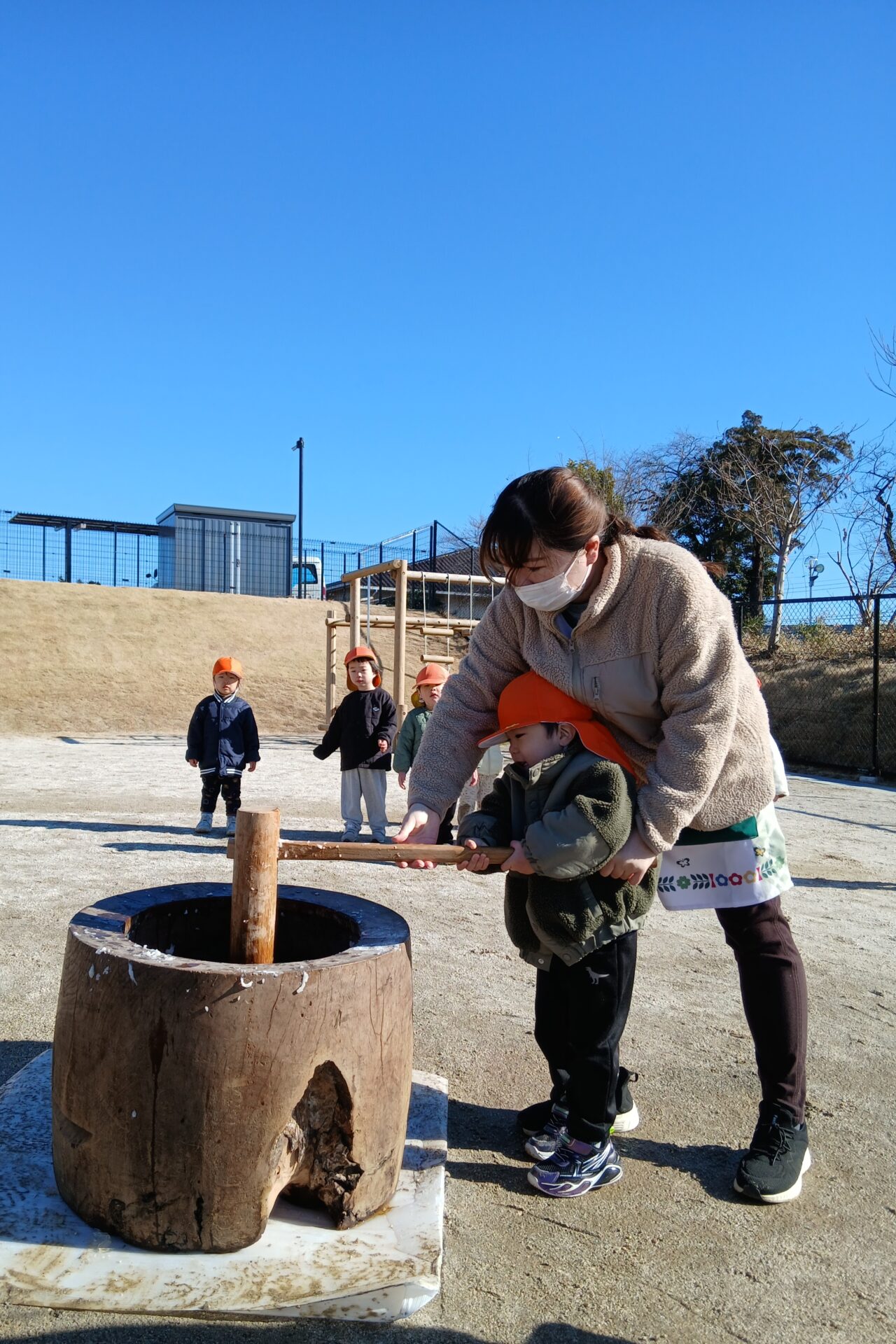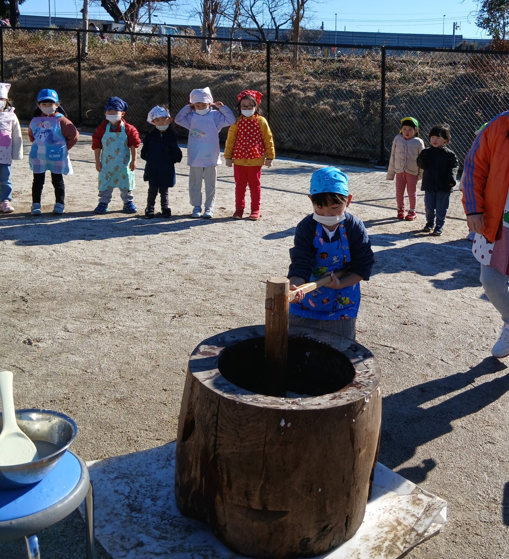 おもちつきを行いました。うみチームとだいちチームのお友だちは、蒸したもち米をみたり、先生や友だちが杵でつく様子をじっと見つめる姿が見られました🎵