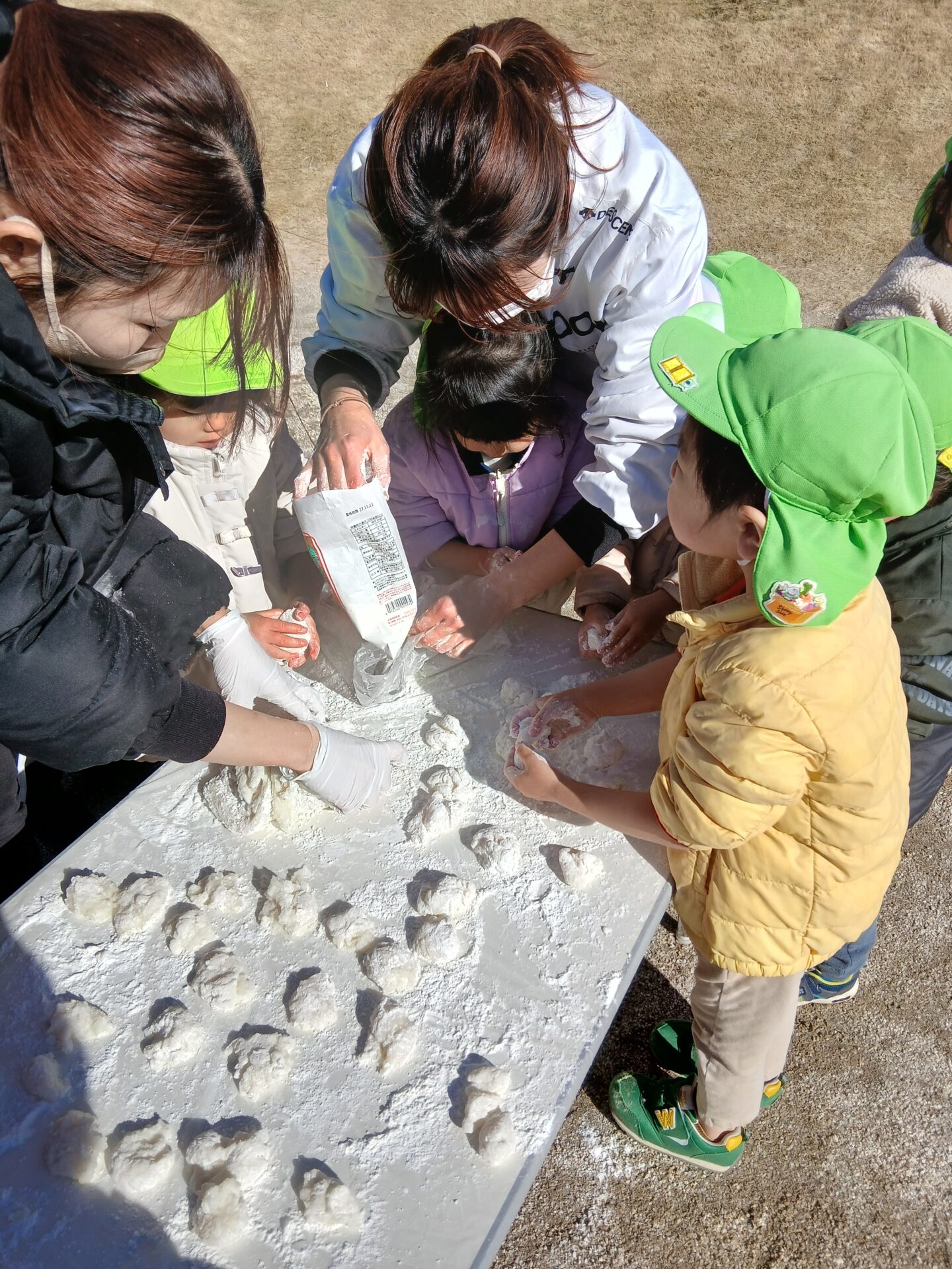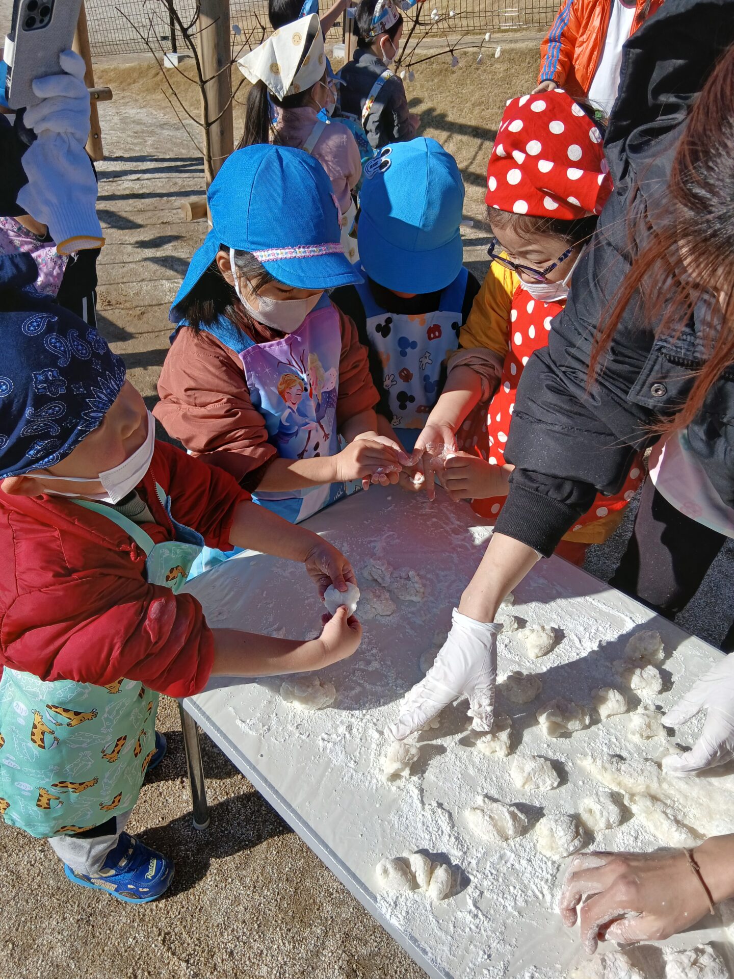 おもちつきが終わるとみんなでおもちを丸くしました。おもちを丸くして木につけるのはにじ・そら・くじらで行いました😊